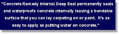 Learn How Concrete RemedyDeep Seal (DS) WorksConcrete Remedy DS does not fill visible cracks larger than about .75mm, but it will waterproof poured concrete slabs and walls. Concrete Remedy DS contains a proprietary catalyst which "pursues moisture" in concrete, and upon contact reacts with the "free" alkali (lime) and calcium hydroxides (already in concrete or masonry) to form a silica gel inside the concrete. This gel moves via capillary action deep into the slab. The gel dries hard like glass inside the concrete turning the entire depth penetrated into a solid mass. This internal, permanent seal and water barrier also hardens and dust-proofs the surface while increasing the compressive and flexural strength.