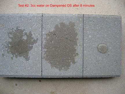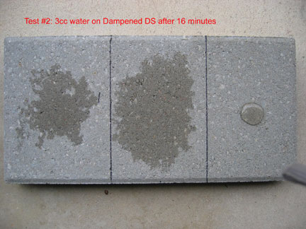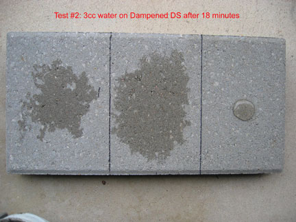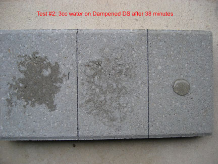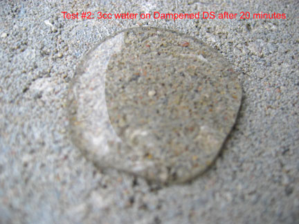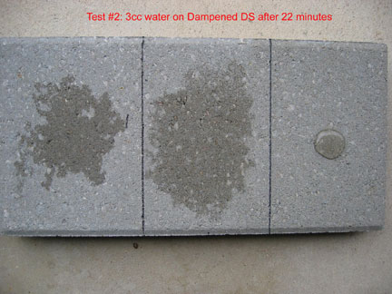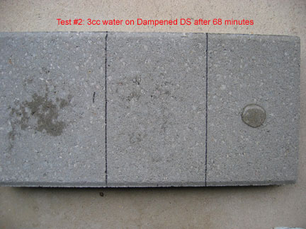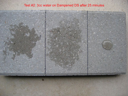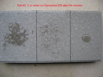 This is a closeup of the 3 cc's of water on the right hand side, which was treated with DS and then TS... after 20 minutes. The area about the size of a 50 cent piece stayed the same until it eventually evaporated more than 30 hours after application. Had that 3 ccs of water been broomed off, that area would have been dry in a few minutes. However, the beading effect does not necessarily last... it is not designed as a "beading" material. Instead it "holds out" moisture even though the surface tension does not create beading. The way Top Seal works is quite different from commonly used sealers that advertise if it stops beading you have to reapply. That is NOT true of Top Seal because it works differently.