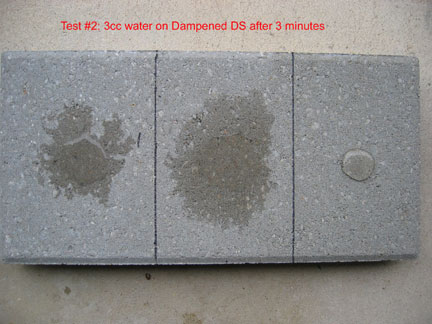 How Do Deep Seal and Top Seal Work Together?In the marketplace, many companies make "combination products". That is, one product with a combination of raw ingredients. They will harden or densify the concrete and also provide repellency for the surface by putting on just one product, i.e., the "combination product". While these products do work, it is my belief that combining the two different type of ingredients into one product results in a reduced performance. In other words, the ingredients tend to work against one another as opposed to creating a positive synergy. In my opinion, the only reason for making a "combination" product is a marketing decision. Most people prefer to buy only one thing and to keep projects as simple, quick and cheap as possible. So combination products are easier to sell. The idea sounds good. The reason I advocate using two separate products (e.g., Deep Seal and Top Seal) instead of a "one step" combination product is that I believe the results are superior. Instead of the two materials competing with each other when applied to concrete in a combination product, you realize a building block effect. The Deep Seal applied by itself forms the foundation and the Top Seal applied over the Deep Seal builds repellency in a stronger manner when done separately. These pictures are of testing done with Deep Seal and Top Seal to show how the products work together. The left section of the slab is bare, the middle section was treated with DS. The right section was treated with DS which was allowed to dry one day, then the area dampened with water. The TS was applied on a dampened surface which was still dark gray. Application rates were at 150 sq. ft. per gallon.... which worked out to 7ccs per each 40 sq. in area. After a day, 3 cc s of water was put on each of the areas and pictures taken over a period of a little over an hour. The right hand section with the beaded water stayed like that over 24 hours with the water finally evaporating after about 36 hours. This picture shows that the 3 ccs in the middle, DS section is already spreading out more than in the left section. The right section shows the water beaded on the DS/TS section. Please Note: The Top Seal product is not made for the purpose of "beading" liquids. The beading effect is temporary... it may stop beading after a few months or longer. The sample shows it beading simply because I didn't have an old enough sample which had stopped beading. Just because it stops beading DOES NOT mean that more must be applied. It doesn't work as surface films do. Instead, it holds the water out from the inside out. You will notice that over time, the water darkened area in the middle section grows larger than the left spot. The illustrates that on the bare concrete the water tends to soak straight down into the concrete, while in the middle section, the presence of the DS beginning about 1-2 mm below the surface prevents that kind of absorption. Instead, in the middle section the water can only go down about 1-2 mm and then it starts spreading out horizontally...increasing the size of the moisture darkened area. Below, the middle section after 3 minutes covers more than twice the area of the water on the left, bare section